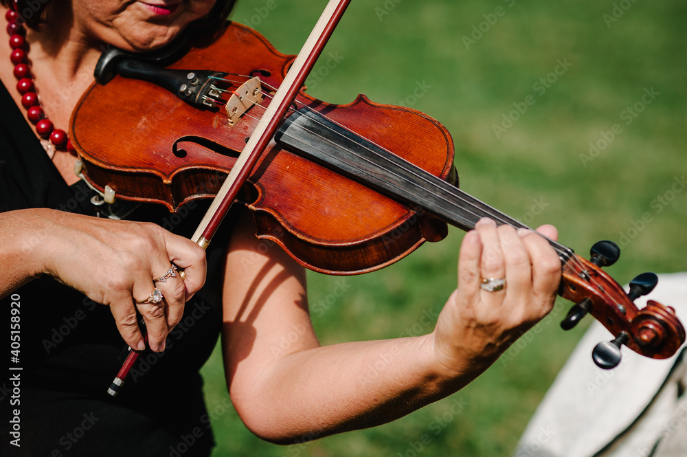Violin Player Hands Violinist Playing Violin On Background Of Field Performance On Nature Close Up Of Musical Instruments Shallow Depth Vintage Style Musical Art Concept Passion In Music Wall Mural Serhii